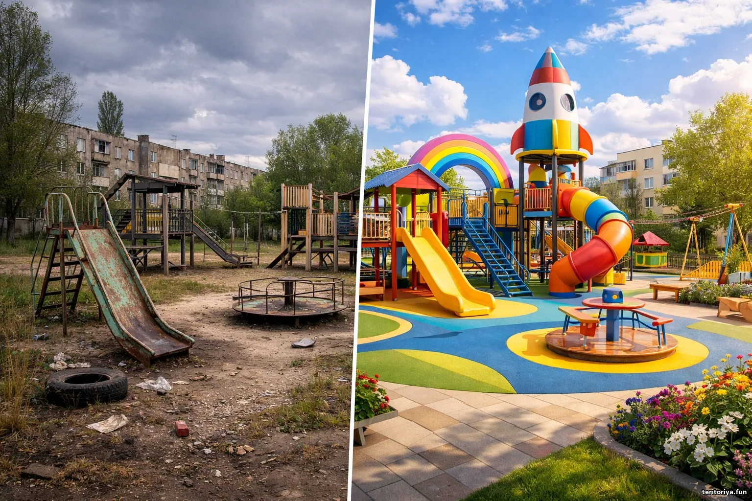 • До/після: зміни - Кадр дня До/після: занедбаний дитячий майданчик поруч із оновленим яскравим 23.02.2026 Контрастний кадр у форматі «до/після»: занедбаний дитячий майданчик змінюється на сучасний, яскравий простір із кольо... alex_Is 6 0 5.0