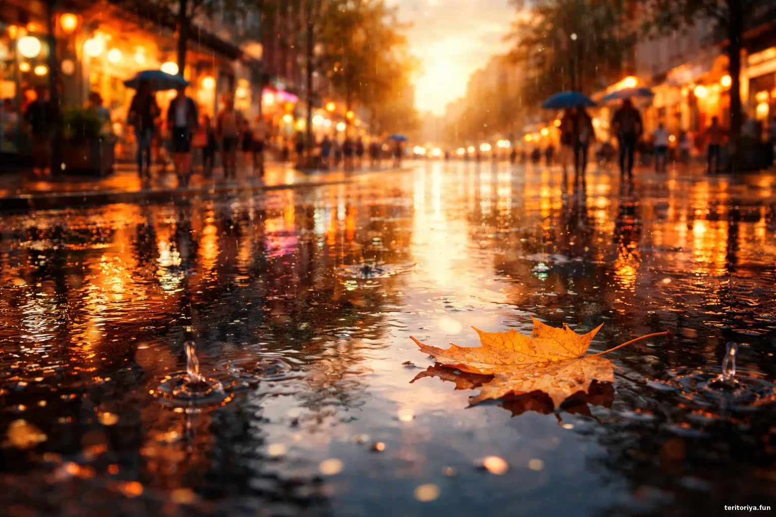 Світла мить після дощу застигла між рухом і тишею. Мокра вулиця перетворюється на дзеркало, в якому тремтять золотаві вогні міста, розмиті силуети перехожих і тепле вечірнє небо. На передньому плані самотній листок підкреслює крихкість цієї сцени, де віддзеркалення стає не менш важливим, ніж реальність. Зображення передає спокій, легку меланхолію та красу миті, що вже минає.