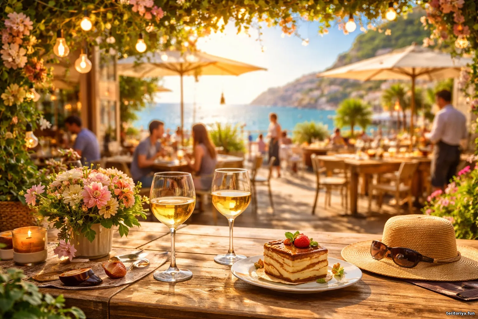 Затишне кафе біля моря завмерло в м’якому сяйві золотого вечора. На дерев’яному столі — келихи вина, десерт, квіти й капелюх, ніби випадково залишені після щасливої розмови. Тепле світло, розмиті силуети гостей, блиск води та ніжні відтінки створюють атмосферу спокою, легкості й пам’яті про коротку, але дуже живу мить, що не зникла, а залишилась у серці як світлий післясмак подорожі.