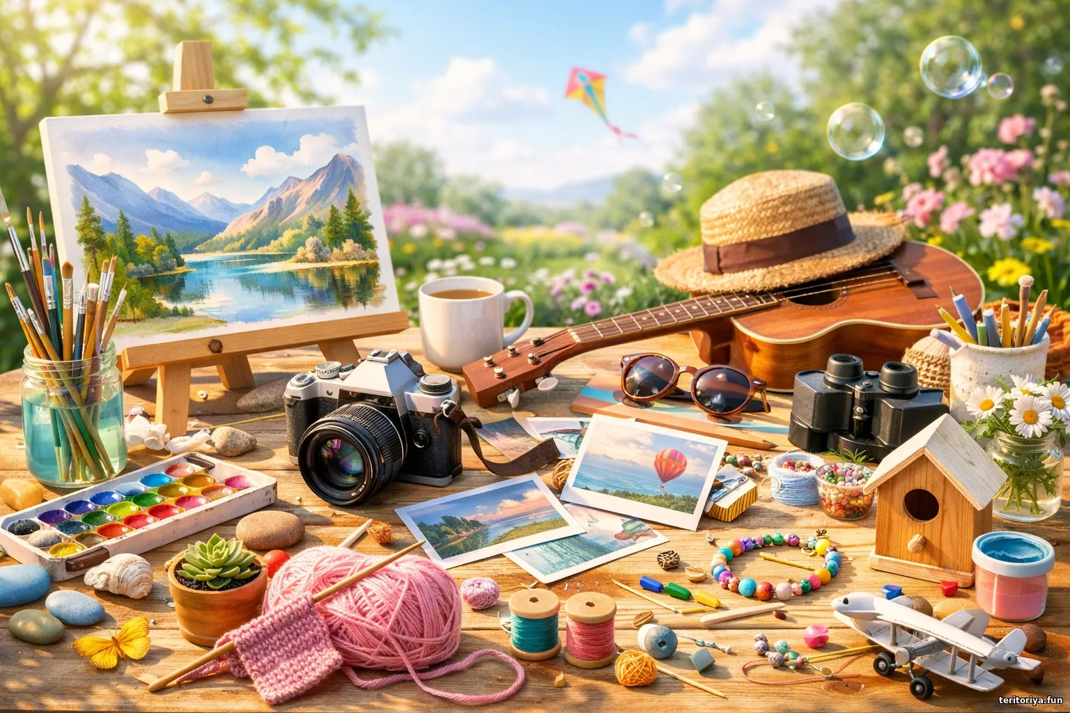 • Хобі та натхнення - Кадр дня Кольоровий стіл із предметами для хобі на сонячному подвір’ї: мольберт 23.02.2026 Яскравий широкий кадр у світлих тонах: творчий стіл просто неба з атрибутами хобі — фарбами, фотоапаратом, укулеле, р... alex_Is 7 0 5.0