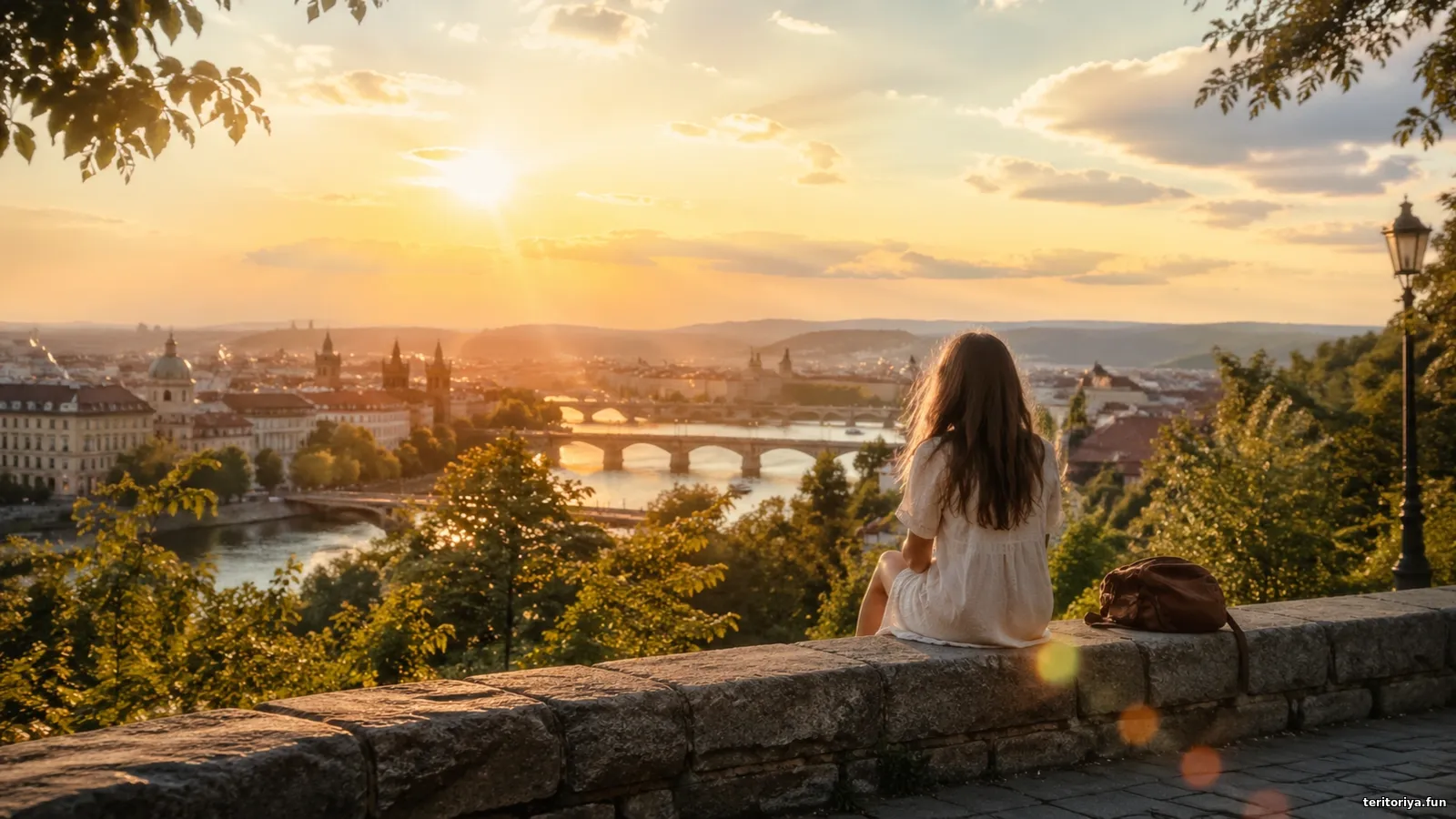 На фото — тепла мить на межі дня і спогаду: дівчина сидить на кам’яній терасі над містом, залитим золотим світлом заходу. Річка, мости, старовинні дахи й м’які хмари створюють відчуття тиші, вдячності та легкої ностальгії. Це кадр про момент, який уже минає, але залишається всередині як найкращий спогад року.