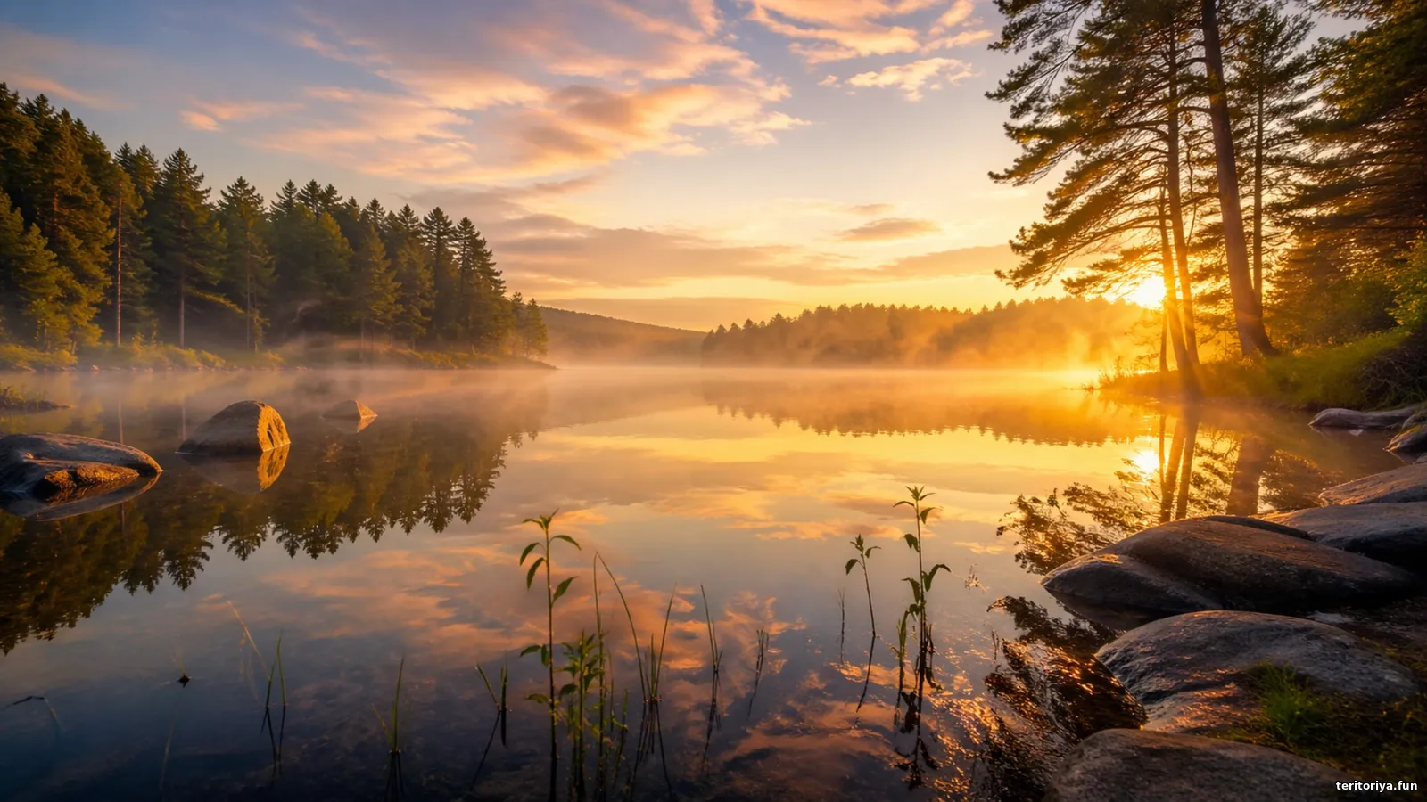 Тиха гладінь озера зберігає мить, у якій світло, вода й ліс завмирають в одному подиху. М’яке золоте сяйво торкається туману над водою, дерева віддзеркалюються в спокійній поверхні, а камені біля берега додають відчуття природної стійкості. Це фото про тишу, пам’ять і красу короткої миті, яка ніби залишилась між ранком і сном природи.