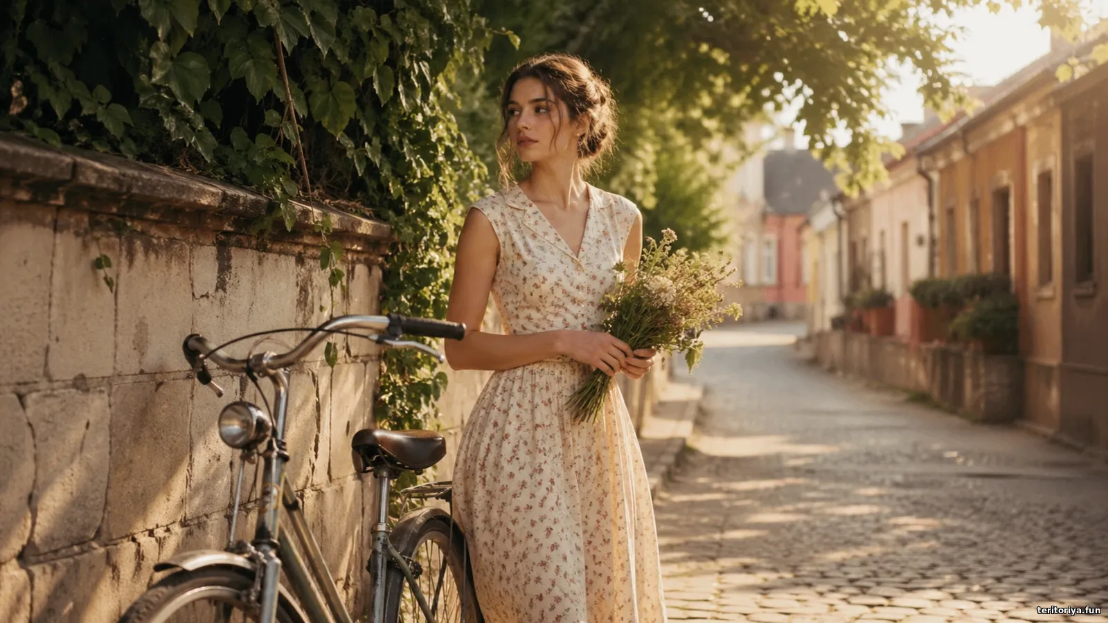 Світлий ретро-кадр про мить, що ніби випадково зупинилася між минулим і теперішнім. Тиха вуличка, тепле сонце, вінтажний велосипед, ніжна сукня та букет польових квітів створюють відчуття спогаду, який не тьмяніє з роками. Фото передає легку ностальгію, спокій і красу простих моментів, коли час на секунду завмирає, залишаючи в серці теплий слід.