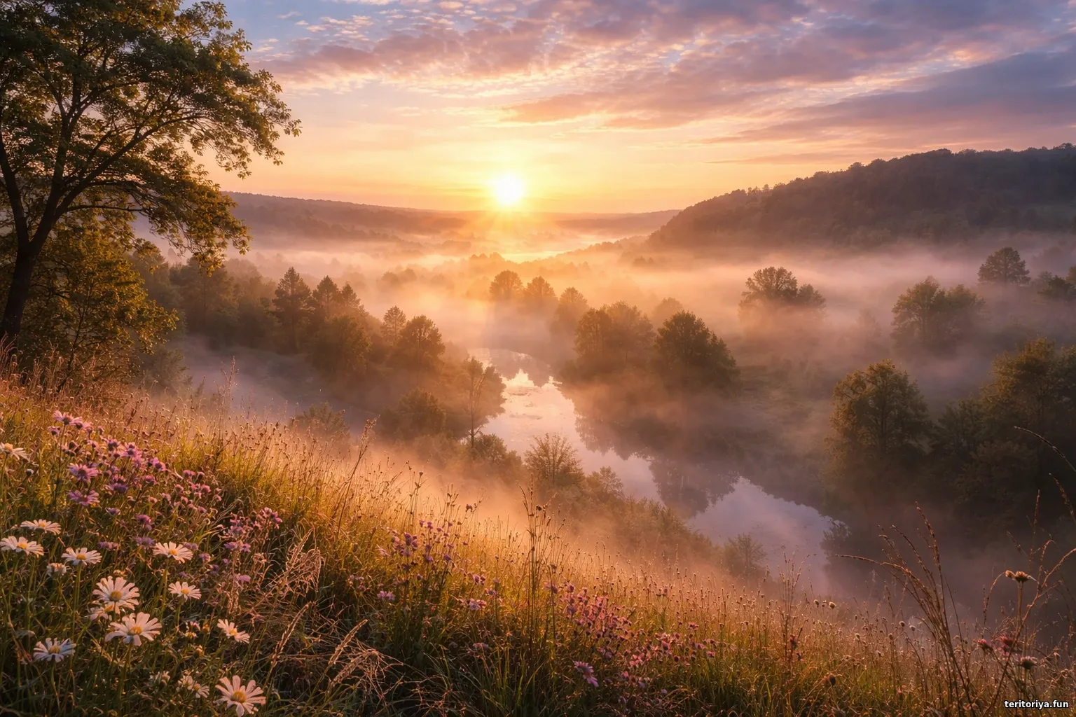 Мить, що лишилась — це образ світанку, який ніби затримав подих між сном і пробудженням. Легкий туман огортає долину, м’яке сонячне світло розливається над деревами й водою, а теплі відтінки неба створюють відчуття тиші, спокою та крихкої краси. Світлина передає ту коротку секунду, коли природа ще мовчить, але вже наповнюється новим днем, залишаючи по собі враження ніжності, світла і пам’яті про щось дуже особисте.