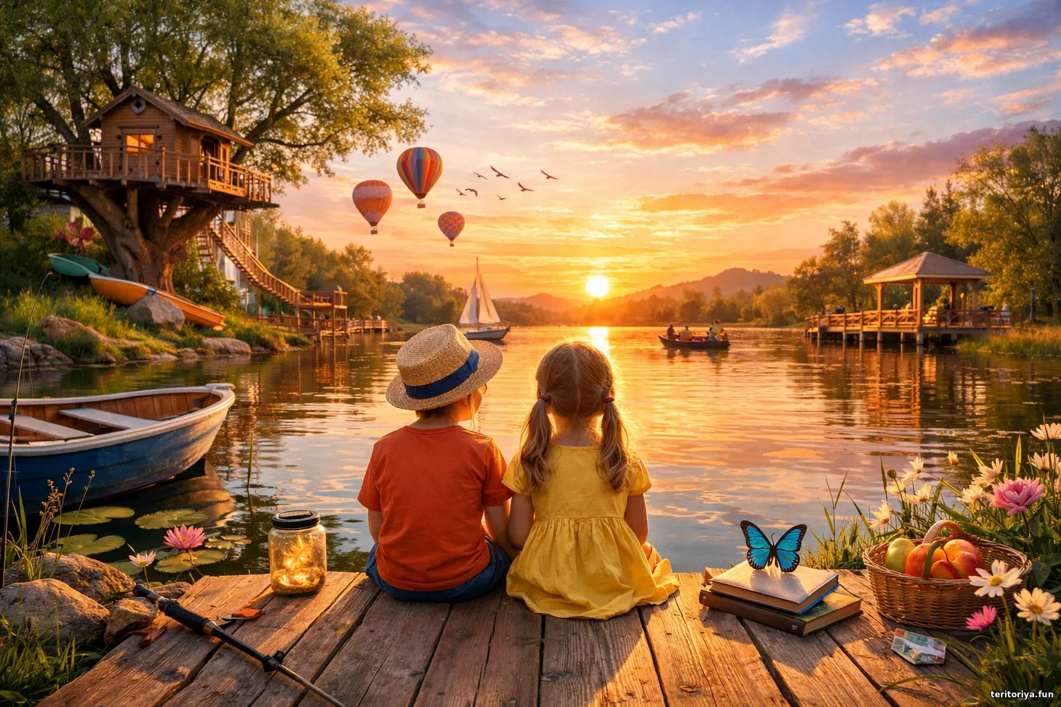 • Улюблені місця - Кадр дня Двоє дітей сидять на дерев’яному пірсі біля озера на заході сонця 23.02.2026 Яскравий широкий кадр у світлих тонах: затишне озеро на заході сонця, човни, будиночок на дереві та тепла сімейна атм... alex_Is 9 0 5.0