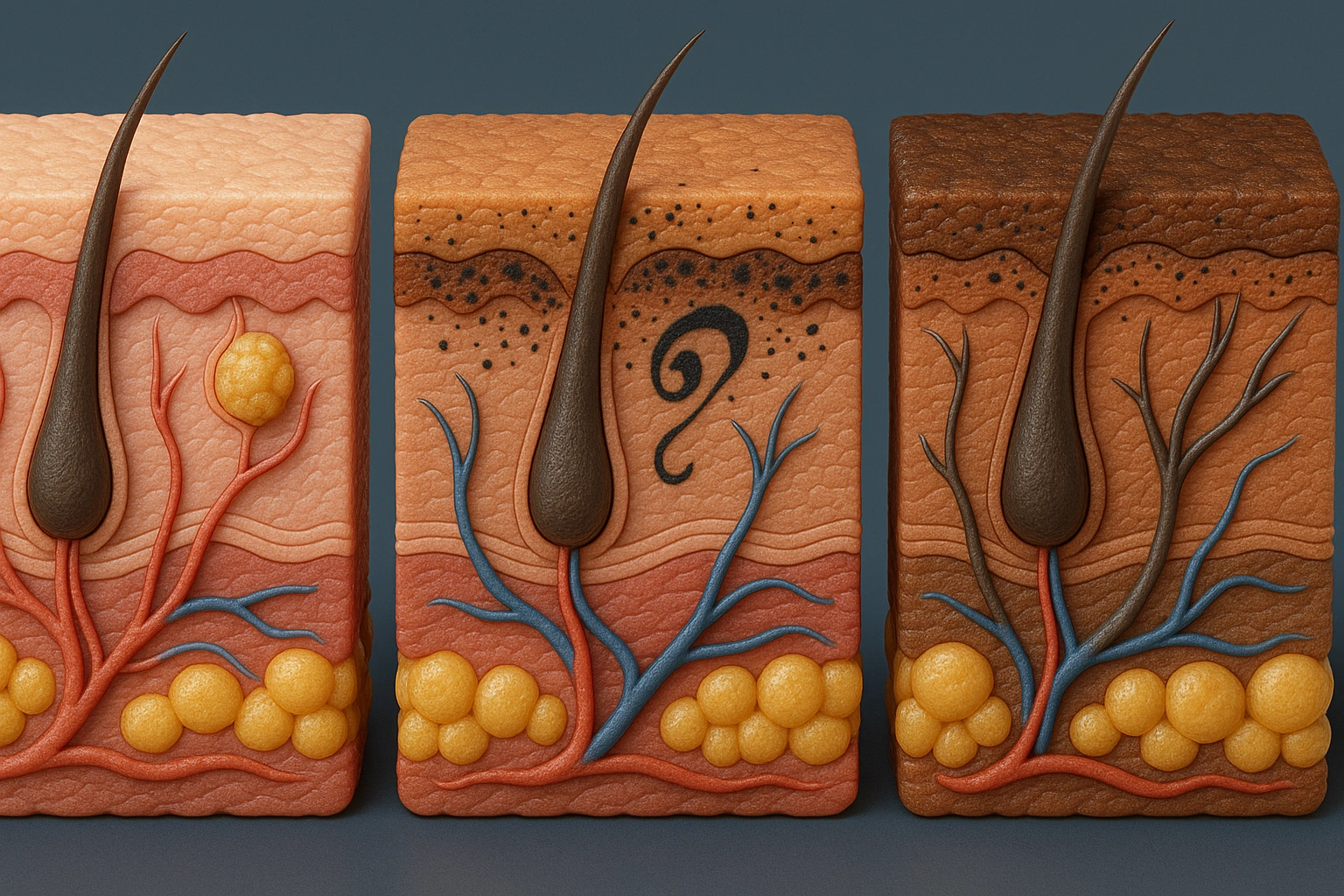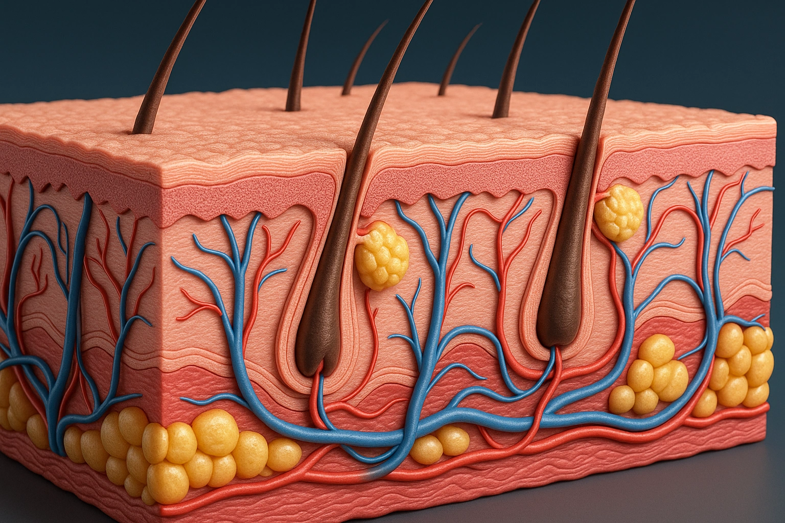 Что такое кожа?Кожа — это первое, что мы видим в человеке. Это бархат младенчества, прочность зрелости, складки возраста. Это поверхность, за которой скрывается целый мир. Но кожа — это не просто оболочка. Она не просто «прикрывает» тело. Она живёт, дышит, чувствует, защищает. Это орган — самый большой и самый выносливый в человеческом организме. С раннего детства и до последних дней кожа сопровождает нас, принимает удары, ощущает прикосновения, меняется, стареет, обновляется. Она отражает наше здоровье, наши эмоции, образ жизни и даже нашу историю. Но что мы на самом деле знаем о коже? Погрузимся в изучение этого удивительного органа, в котором соединяются анатомия, биология, эстетика и философия. Кожа — орган, а не просто покрытиеКогда мы думаем об органах, на ум приходят сердце, печень, лёгкие. Но мало кто вспоминает, что кожа — это тоже орган, причём самый обширный. У взрослого человека площадь кожи достигает до двух квадратных метров, а вес — около 15% от общей массы тела. Кожа — это биологическая граница, которая разделяет внутренний мир организма и внешнюю среду. Она одновременно и щит, и фильтр, и антенна, и терморегулятор. Её сложно заменить и невозможно игнорировать. Строение кожи: три уровня жизниКожа состоит из трёх основных слоёв, каждый из которых выполняет свои задачи: 1. Эпидермис — внешний барьерЭто самый поверхностный слой, который мы видим и можем потрогать. Он состоит из мёртвых и живых клеток, которые постоянно обновляются. Клетки эпидермиса рождаются в глубине и постепенно поднимаются к поверхности, где отмирают и отпадают. В эпидермисе нет кровеносных сосудов, но он содержит меланоциты, вырабатывающие меланин — пигмент, определяющий цвет кожи и защищающий от ультрафиолета. 2. Дерма — основа и опораПод эпидермисом лежит дерма — плотный, прочный, эластичный слой, богатый коллагеном и эластином. Именно дерма обеспечивает коже прочность, способность к растяжению и упругость. В дерме находятся:
