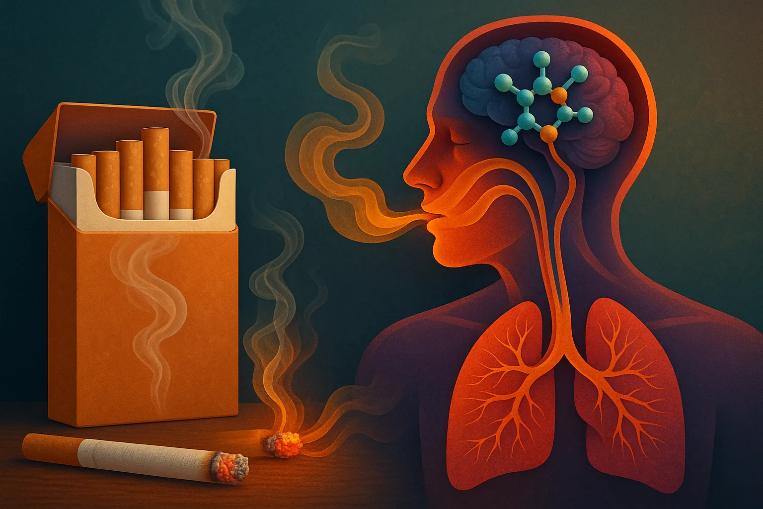Эти эффекты возникают очень быстро. После затяжки сигареты никотин достигает мозга за 10–20 секунд. Именно эта скорость и интенсивность удовольствия делают никотин столь опасным с точки зрения зависимости. Никотиновая зависимостьНикотин вызывает одну из самых сильных форм зависимости, сравнимую с героином или кокаином. Но в отличие от запрещённых наркотиков, он доступен легально. Зависимость формируется на трёх уровнях: 1. Физическая зависимостьОрганизм привыкает к постоянному воздействию никотина. Без него возникают синдром отмены: раздражительность, тревожность, головные боли, нарушения сна, повышенный аппетит. Эти симптомы заставляют человека снова тянуться к сигарете. 2. Психологическая зависимостьКурение становится ритуалом, частью привычной картины дня: за чашкой кофе, в компании, на перерыве. Мозг связывает курение с расслаблением, перерывом, наградой. 3. Поведенческая зависимостьОпределённые ситуации автоматически вызывают желание закурить. Повторение формирует устойчивую связь между действием и реакцией, и избавиться от этого рефлекса бывает сложно даже после физического отказа от никотина. Влияние никотина на здоровьеХотя сам по себе никотин не является основным канцерогеном, он играет ключевую роль в поддержании привычки курения, а значит, косвенно участвует в развитии множества заболеваний. Курение табака — основной путь попадания никотина в организм, и вместе с ним человек вдыхает десятки канцерогенов, смол, угарного газа, тяжёлых металлов. Длительное употребление никотина приводит к: