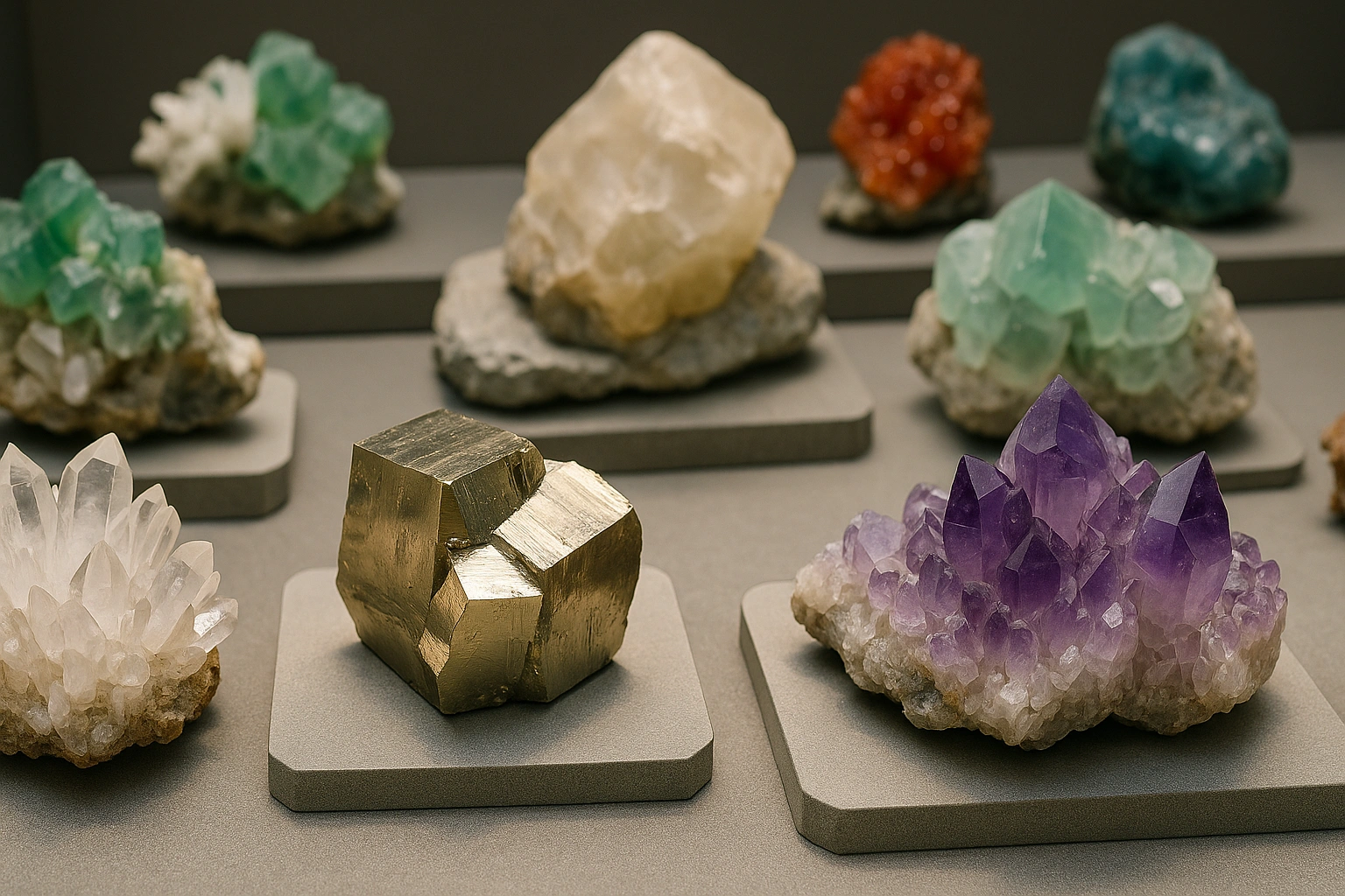 Свойства минераловМинералы классифицируются и описываются по множеству признаков. Среди них: ЦветЭто первое, на что обращает внимание человек. Цвет может быть характерным (например, у малахита — зелёный), но иногда один и тот же минерал может встречаться в разных оттенках из-за примесей. БлескБлеск может быть металлическим, стеклянным, жирным, матовым. Он зависит от отражательной способности поверхности минерала. ПрозрачностьНекоторые минералы — прозрачные (горный хрусталь), другие — полупрозрачные или непрозрачные. ТвёрдостьМера сопротивления минерала к царапанию. Измеряется по шкале Мооса — от 1 (тальк) до 10 (алмаз). Спайность и изломНекоторые минералы имеют свойство легко раскалываться по определённым направлениям — это спайность. Излом описывает, как ведёт себя поверхность при разрушении — может быть раковистым, занозистым, ровным. Кристаллическая формаМногие минералы имеют геометрически правильную форму кристаллов — кубы, призмы, октаэдры. Это результат их внутренней атомной структуры. Классификация минераловМинералы делятся на классы в зависимости от их химического состава и структуры: