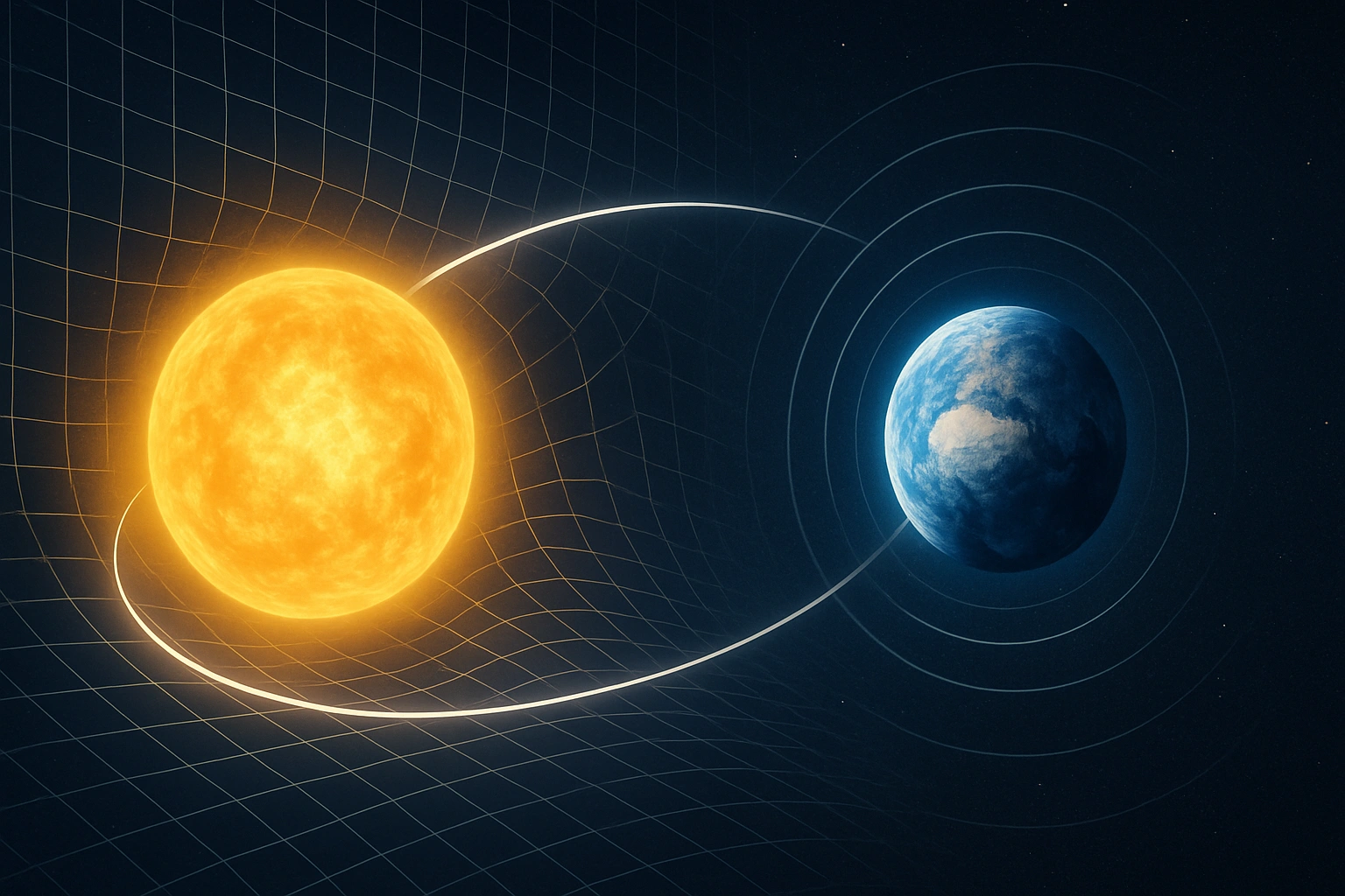 Из этих простых на первый взгляд утверждений вытекают поразительные следствия. Относительность времениВ рамках СТО время перестаёт быть абсолютным. Оно становится относительным: разные наблюдатели, движущиеся относительно друг друга, измеряют разные интервалы времени между событиями. Это явление называется замедлением времени. Например, если космонавт летит на космическом корабле с большой скоростью, то его часы идут медленнее по сравнению с часами на Земле. Для него самого всё будет казаться нормальным, но по возвращении он обнаружит, что на Земле прошло больше времени. Эффект замедления времени был подтверждён экспериментально с помощью сверхточных атомных часов и частиц, движущихся со скоростями, близкими к скорости света. Относительность длиныЕщё одно удивительное следствие — сокращение длины. Объекты, движущиеся с высокой скоростью относительно наблюдателя, кажутся сжатыми вдоль направления движения. Например, если бы космический корабль летел мимо Земли с околосветовой скоростью, наблюдатели на Земле увидели бы его укороченным в направлении движения. Для самих пассажиров корабля его размеры остались бы привычными. Эквивалентность массы и энергииОдним из самых известных результатов специальной теории относительности является формула: E = mc² Эта формула выражает потрясающую истину: масса и энергия взаимосвязаны. Масса — это форма энергии. Небольшое количество массы можно преобразовать в огромное количество энергии. Этот принцип лежит в основе работы ядерных реакторов и водородных бомб. Он также объясняет, как звёзды, включая наше Солнце, излучают свет и тепло: в их недрах происходит преобразование массы в энергию. Общая теория относительностиСпустя десять лет после создания СТО Эйнштейн представил ещё более грандиозное обобщение — общую теорию относительности (ОТО). Она касалась движения тел не только с постоянной скоростью, но и в условиях ускорения, а главное — объясняла природу гравитации. До этого момента гравитация воспринималась как сила, притягивающая тела друг к другу. Эйнштейн предложил иной взгляд: гравитация — это проявление искривления пространства-времени. Пространство-времяВ рамках ОТО пространство и время сливаются в единое четырёхмерное образование — пространство-время. Масса и энергия искривляют это пространство-время, создавая эффект, который мы воспринимаем как гравитацию. Представьте себе натянутую ткань: если на неё положить тяжёлый шар, ткань прогнётся. Если пустить по ткани маленький шарик, он будет двигаться по изогнутой траектории вокруг большого шара. Точно так же планеты движутся вокруг Солнца не потому, что их "тянет" какая-то сила, а потому что пространство-время искривлено солнечной массой. Следствия общей теории относительностиОТО предсказала множество явлений, которые были позже подтверждены наблюдениями: