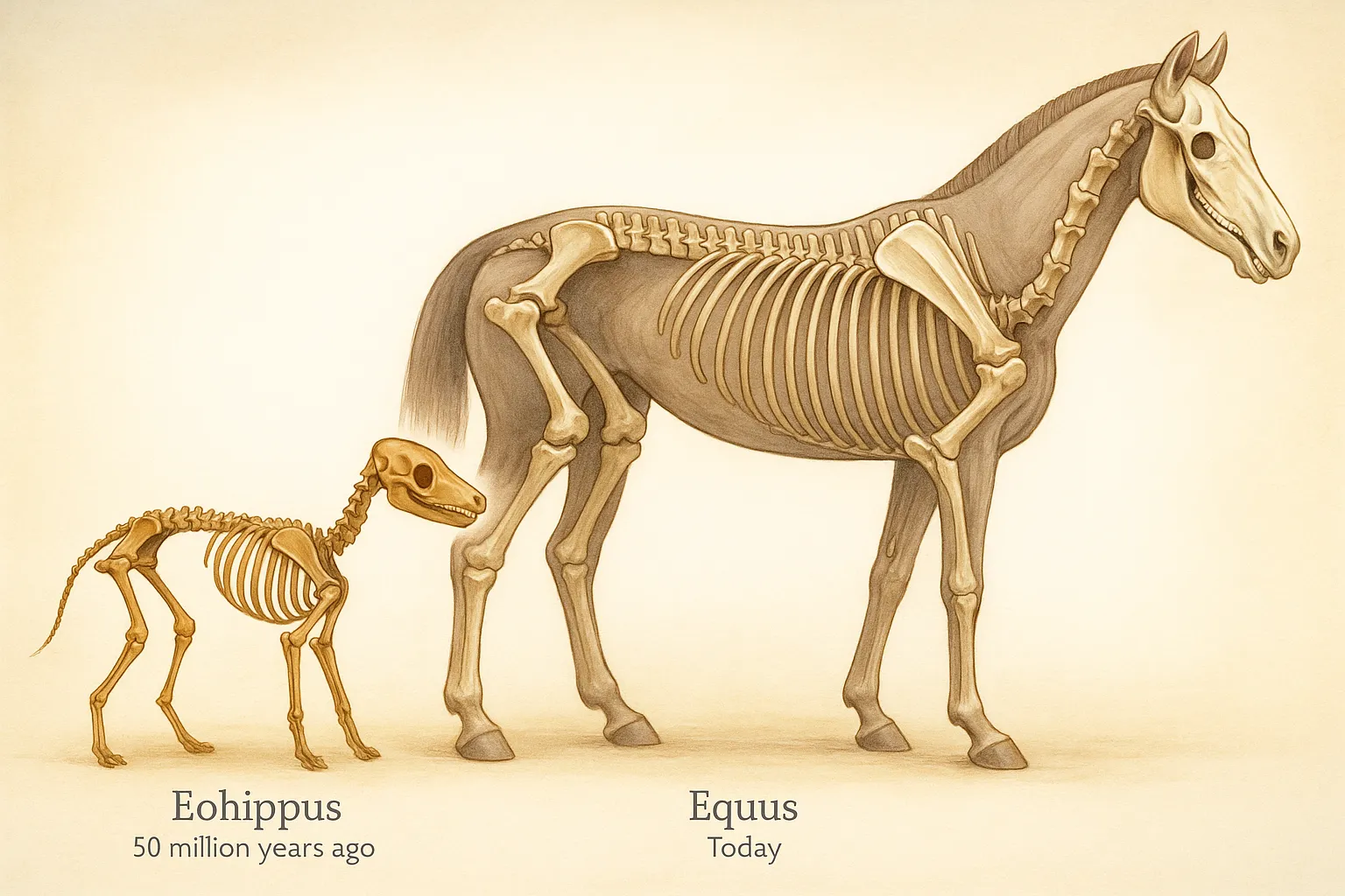От какого животного произошла лошадь?Когда мы смотрим на лошадь — стройную, могучую, стремительную — трудно представить, что её предок когда-то был крошечным, лесным зверьком размером с лису, прятавшимся в зарослях от хищников. Лошадь, символ свободы, силы, человеческой цивилизации, — это результат миллионов лет эволюции, удивительного превращения, полного неожиданных поворотов и биологических чудес. Как появилось это благородное животное? От какого существа произошла лошадь? Что изменилось в её теле, поведении, строении копыт и зубов за десятки миллионов лет? Почему эволюция выбрала именно такой путь — от мелкого копытного к быстрому степному скакуну? В этой статье мы отправимся в далёкое прошлое Земли, когда ещё не было людей, но уже начиналась история одного из самых удивительных животных — лошади. Где начинается история?История лошадей начинается не на равнинах Евразии и не на лугах Америки, а в лесах Северной Америки, примерно 56 миллионов лет назад, в эпоху, которую учёные называют эоценом. Климат тогда был тёплым и влажным, обширные леса покрывали континенты, а среди деревьев обитали древние предки современных млекопитающих. Именно в таких условиях и появился Eohippus, что в переводе с латинского означает «рассветная лошадь». Это существо считается древнейшим известным предком лошади. Eohippus — первая "лошадь"Eohippus (другое название — Hyracotherium) был совсем не похож на современную лошадь. Его рост составлял около 30–40 см в холке, он весил не больше 5–6 килограммов и напоминал скорее маленького лисовидного зверька с тонкими ножками и короткой мордой. Главные особенности: