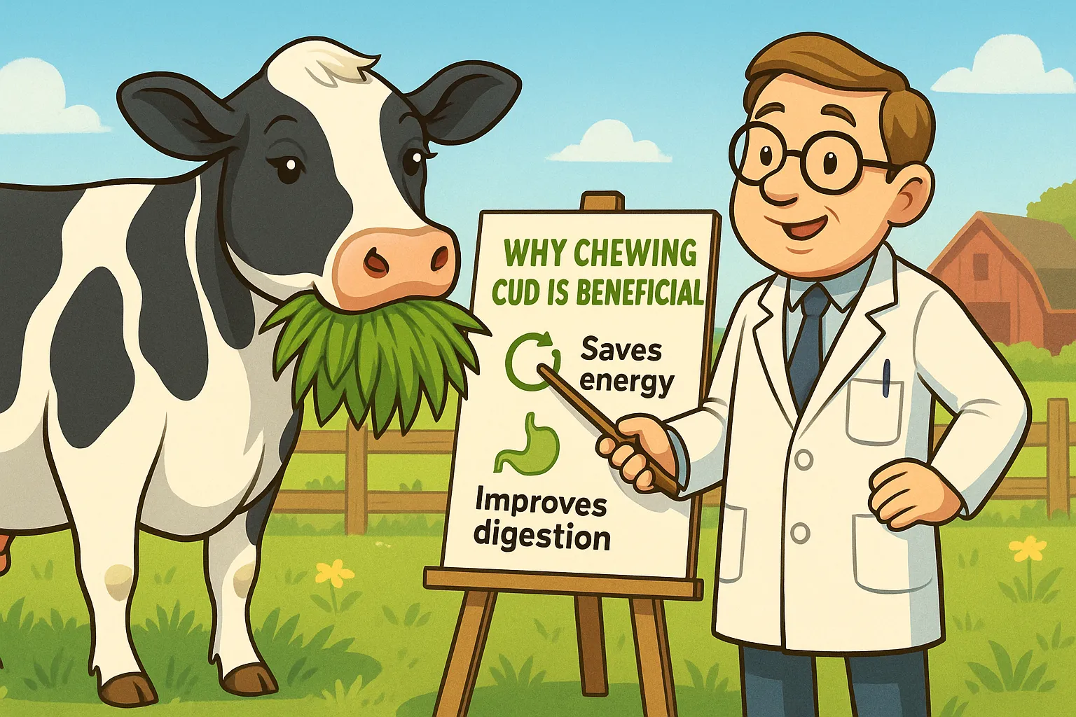 Почему коровы жуют жвачку?Утро на пастбище начинается спокойно. Тёплый пар поднимается от тела коровы, капли росы блестят на траве, и в этой тишине звучит ритмичное, неторопливое — жжж-жжж — жевание. Коровы стоят или лежат, смотрят в даль, и жуют, жуют, жуют… Эта картина знакома каждому, кто хоть раз наблюдал за коровами. Жевание жвачки — неотъемлемая часть их повседневной жизни. Но что это за жвачка? Почему коровы так долго и усердно её пережёвывают? Зачем природа наделила их такой привычкой? На первый взгляд, это может показаться простым действием. Но на деле жевание жвачки — сложный, эволюционно выработанный процесс, жизненно важный для коровы и других жвачных животных. В этой статье мы разберёмся, что такое жвачка, как она формируется, почему её надо жевать повторно, и как это связано с уникальным строением пищеварительной системы коров. Что такое жвачка?Жвачка — это частично переваренная пища растительного происхождения, которая была проглочена животным, но затем вновь возвращена в рот для повторного пережёвывания. Это нечто среднее между кашицей и комком травы, пропитанным слюной и желудочными соками. Формирование и жевание жвачки — не случайный процесс, а важнейшая часть пищеварительной системы жвачных животных, таких как коровы, овцы, козы, олени и жирафы. Кто такие жвачные животные?Жвачные — это группа млекопитающих, обладающих уникальным типом желудка, состоящего из четырёх отделов: рубца, сетки, книжки и сычуга. Это не четыре отдельных желудка, как иногда думают, а четыре взаимосвязанные камеры, каждая из которых выполняет свою задачу в процессе пищеварения. Такое строение позволяет жвачным переваривать грубую, волокнистую растительную пищу, которую большинство других животных усвоить не может. Главная цель — максимально эффективно извлечь питательные вещества из травы, листьев, сена и других растительных материалов. Почему коровам приходится жевать пищу дважды?Ответ кроется в природе их рациона. Трава, которой питаются коровы, содержит целлюлозу — жёсткое вещество, составляющее основу растительных клеточных стенок. Целлюлоза практически неперевариваема без помощи микроорганизмов, а чтобы помочь им работать, необходимо как следует раздробить, смочить и ферментировать корм. Первый этап: быстрое заглатываниеКогда корова пасётся, она быстро срывает траву, почти не пережёвывая её, и заглатывает целыми порциями. Такая стратегия позволяет насытиться быстро, не тратя много времени на месте и не подвергаясь угрозе со стороны хищников. Вся проглоченная пища попадает в рубец — первую и самую крупную камеру желудка. Второй этап: возвращение жвачкиВ рубце начинается ферментация: пища перемешивается с микрофлорой — бактериями, простейшими, грибами, которые разрушают клетчатку. Но чтобы процесс шёл эффективно, пищу нужно механически переработать. Поэтому рубец отправляет порции обратно в рот — корова отрыгивает жвачку и тщательно её пережёвывает. Третий этап: повторное проглатываниеПосле тщательного пережёвывания жвачка проглатывается вновь, проходит в сетку, затем в книжку, где отжимается лишняя жидкость и продолжается ферментация. После этого она попадает в сычуг — последний отдел, аналог человеческого желудка, где уже работает соляная кислота и ферменты. Как долго корова жует жвачку?Коровы проводят в же
