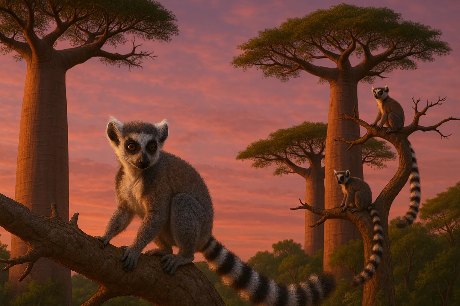 Что такое лемур?Среди густых тропических лесов острова Мадагаскар, где лианы оплетают деревья, а птицы поют свои мелодии на десятках голосов, живут существа, которые словно сошли со страниц сказок или легенд. Они — не обезьяны, но и не кошки. У них огромные глаза, пушистые хвосты, ловкие пальцы и удивительная мимика. Это лемуры — одни из самых таинственных и чарующих приматов планеты. Их имя окутано мистикой, повадки — загадкой, а поведение — множеством открытий для науки. Так кто же они на самом деле? Что за животные прячутся под этим экзотическим названием? Почему они живут только на одном острове в мире? И в чём их уникальность? Лемуры: первые среди приматовС научной точки зрения, лемуры — это приматы подотряда мокроносых (Strepsirrhini), семейства лемуровых (Lemuridae) и нескольких родственных групп. Они являются одними из самых древних представителей отряда приматов и сильно отличаются от человекоподобных обезьян, таких как шимпанзе или макаки. Само слово «лемур» происходит от латинского lemures, что означает «духи умерших». Такое название римляне дали этим животным за их большие глаза, ночной образ жизни и зловещие крики, которые можно услышать в джунглях. На самом деле лемуры вовсе не призраки, а чрезвычайно живые и подвижные существа. Они — живой пример эволюции в изоляции, ведь 90% всех видов обитают исключительно на острове Мадагаскар и ближайших Коморских островах. Виды и разнообразиеНа сегодняшний день известно более 100 видов лемуров, и новые всё ещё открываются. Они различаются по размеру, внешности, повадкам и предпочтениям в питании. Некоторые живут высоко в кронах деревьев, другие предпочитают землю. Одни — ночные одиночки, другие — дневные и социальные. Наиболее известные виды: