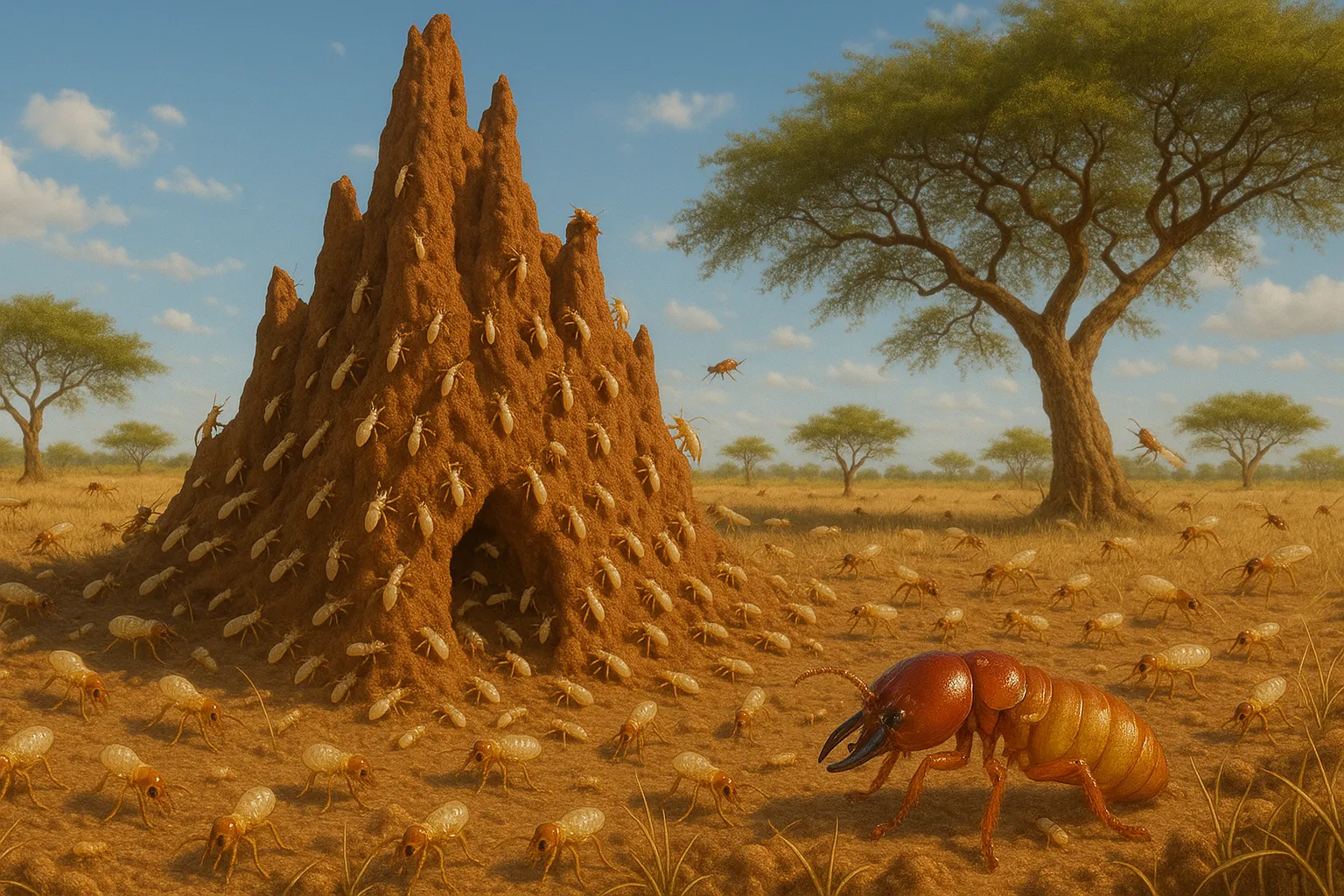 Что такое термиты?Когда мы слышим слово «термиты», перед глазами возникает образ насекомых, разрушающих деревянные дома и прогрызающих балки. Эти крошечные существа, похожие на муравьёв, стали настоящим символом разрушения и настойчивости. Но так ли они опасны, как их рисуют? Кто они на самом деле? И что делает термитов одними из самых загадочных и удивительных существ на нашей планете? Термиты — это больше, чем просто вредители. Это древнейшие мастера архитектуры, создатели сложных обществ с чёткой иерархией, беспощадные солдаты и заботливые кормилицы. Они строят крепости, поддерживают идеальный климат внутри гнезда, обмениваются пищей и даже выращивают грибы. Эти невидимые труженики живут под нашими ногами, в древесине, в почве — и почти всегда остаются вне поля зрения. В этой статье мы подробно разберём, что такое термиты, как они устроены, где живут, как строят свои жилища и почему без них экосистемы не были бы такими, какими мы их знаем. Кто такие термиты?Термиты — это общественные насекомые, образующие колонии с чётким разделением труда. Они относятся к отряду Blattodea, то есть биологически ближе к тараканам, чем к муравьям, с которыми их часто путают. В прошлом их выделяли в отдельный отряд Isoptera, но современные генетические исследования показали их родство с древесными тараканами. На сегодняшний день известно более 3000 видов термитов, обитающих в основном в тропиках и субтропиках, хотя некоторые встречаются и в умеренном климате. Особенно многочисленны они в Африке, Австралии, Южной Америке и Юго-Восточной Азии. Внешность и строениеТело термита состоит из головы, груди и брюшка, как у большинства насекомых. Оно мягкое, часто бледного цвета — белого или кремового. У некоторых каст есть мощные жвала, у других — крылья. Но в целом внешний вид термита сильно зависит от роли, которую он выполняет в колонии. Основные касты термитов: